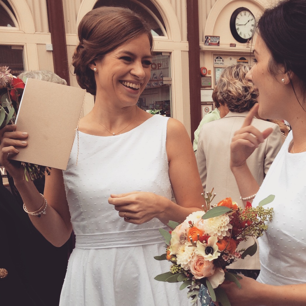 I was delighted to be commissioned to make bridesmaid dresses for these two beautiful bridesmaids. Katie and Gilly looked a picture in pure white.